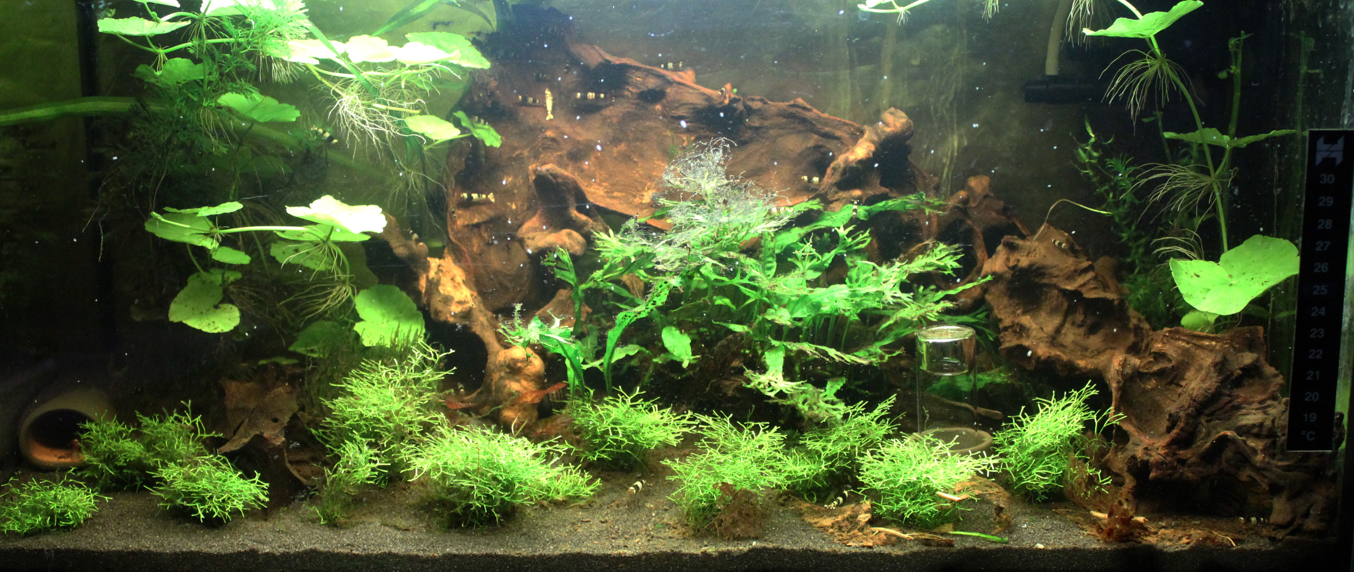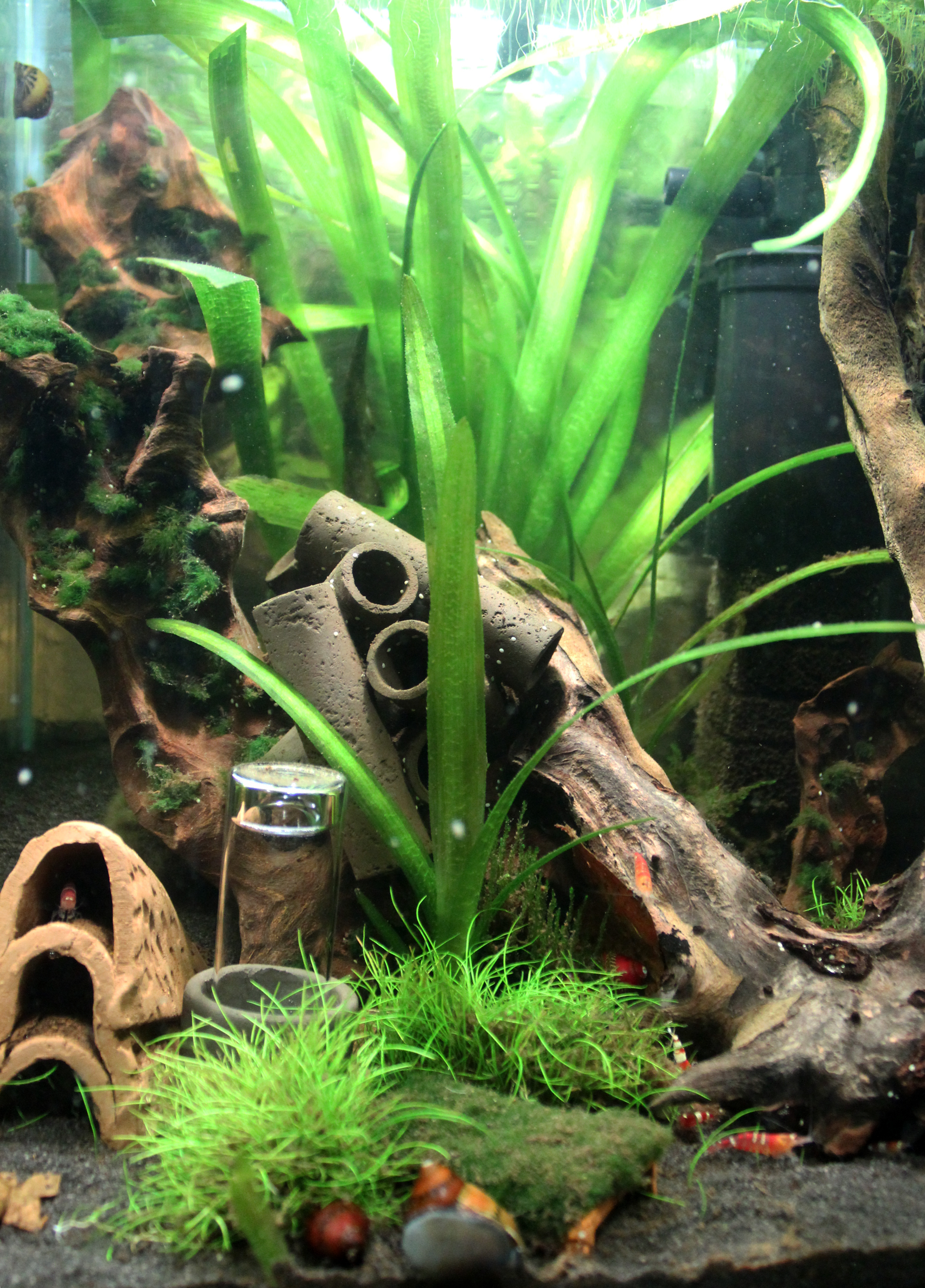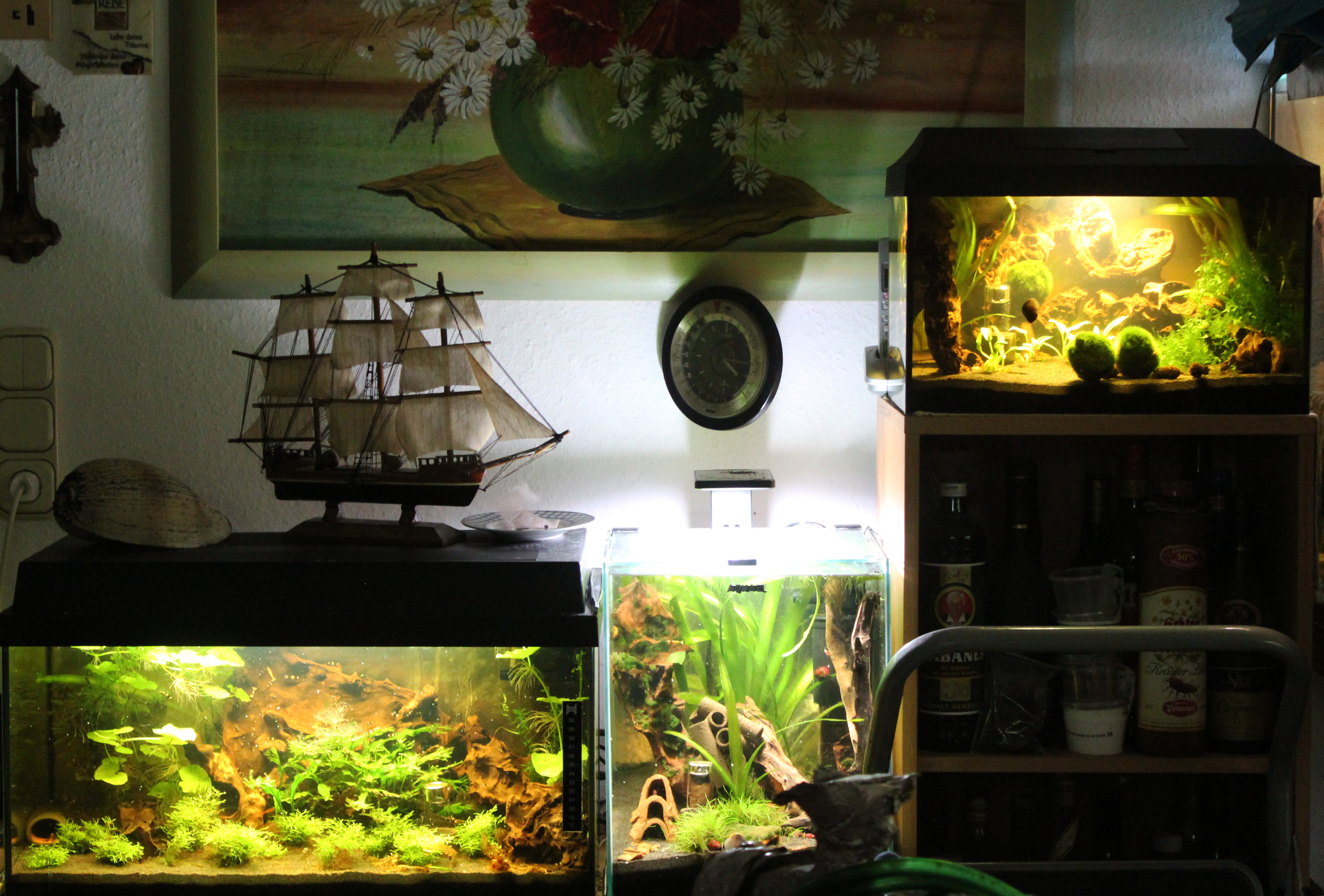 Aquarien und Besatz Heute Fangen wir mal ganz klein an und steigern uns dann: ![]() ![]() ![]() 30l mit goldenen Tigergarnelen 40l mit roten Bienengarnelen 50l mit schwarzen Bienengarnelen zusammen sieht es so aus (ich weiss, fotografisch nicht gerade schön, aber das sind die Fakten): ![]() 200cm Wasser an einem Stück hinter Glas ![]() Als Besatz habe ich hier: Brachysynodontis batensoda Gnathonemus petersii Hernichromis lifalili Phenacogrammus interruptus Xenomystus nigri |